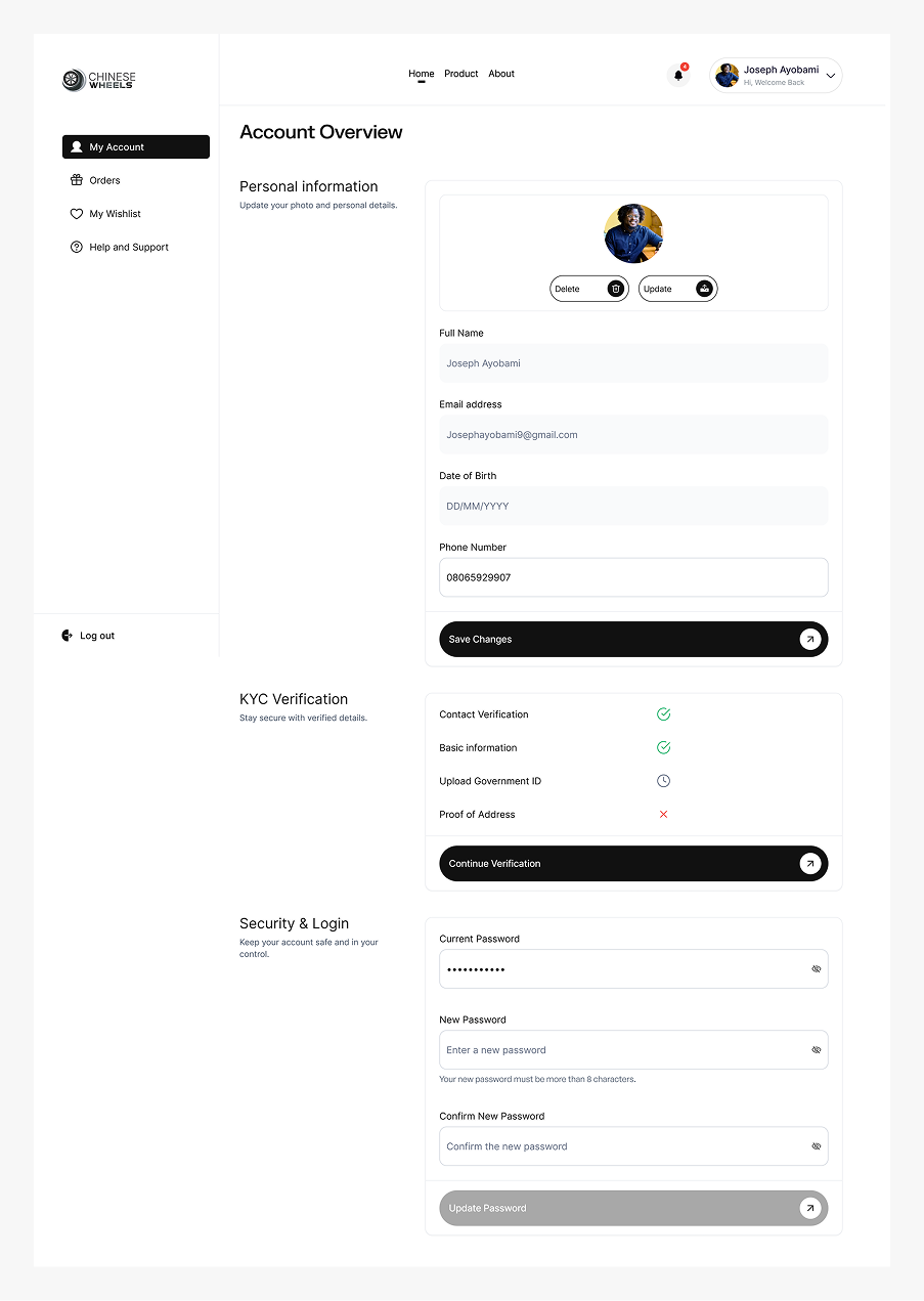 A personal dashboard where buyers manage their details, see their verification status, view orders, and control their account settings.