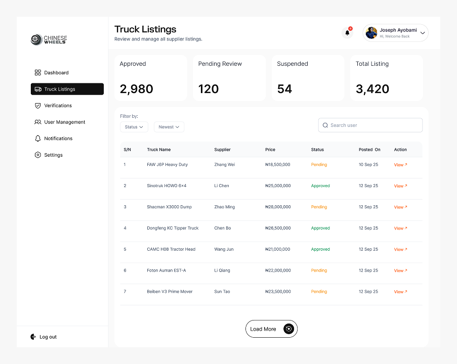 Chinesewheels is a platform that connects verified Chinese truck suppliers with Nigerian buyers. I designed the platform from scratch, focusing on trust, clarity, and a simple buying experience for a market where cross-border purchases are usually stressful and uncertain.