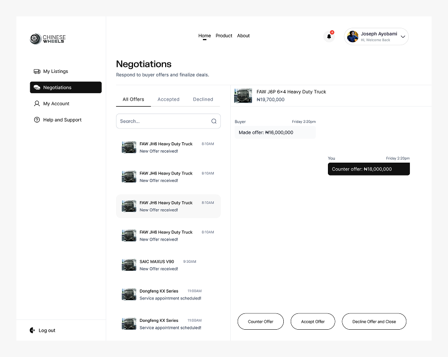 A structured, chat-style negotiation interface where buyers can see offer updates, counter offers, and final decisions, all managed through the admin.