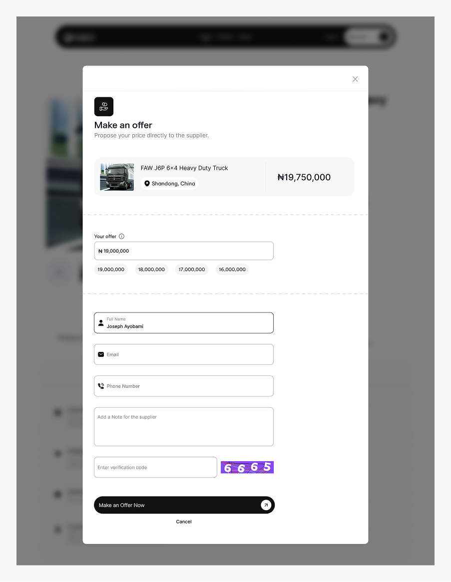 A guided screen where buyers submit their preferred price for a truck. The offer goes to the admin, who forwards it to the supplier.