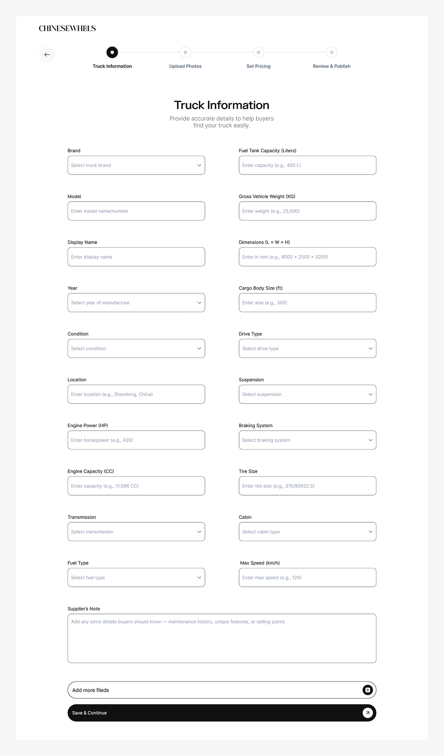 A step-by-step flow that allows suppliers to add a new truck, upload photos, enter specifications, set a price, and publish their listing.