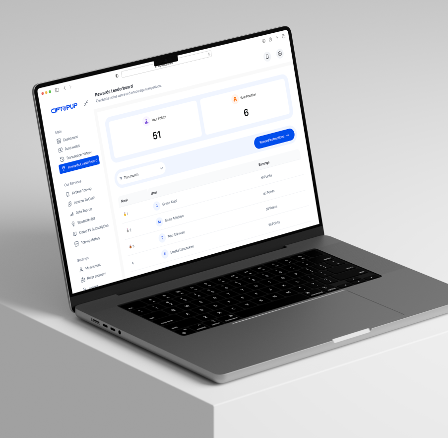 I redesigned the structure, flows, and interface for both web and mobile, creating a more organized layout, a more modern look, and smoother paths for airtime, data, and bill payments. The update also introduced a new rewards and leaderboard system aimed at improving user engagement and retention.