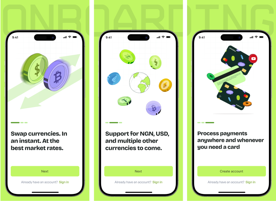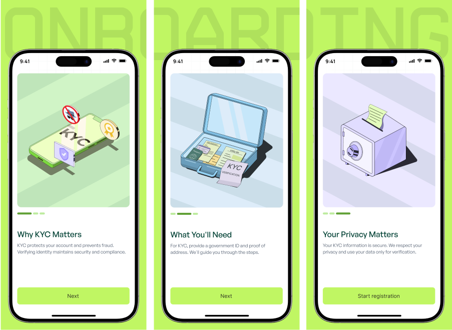 A simple onboarding flow that helps new users set up their account, verify their identity, and understand the core actions of the app. Each step is clear, direct, and designed to help users get started without confusion.