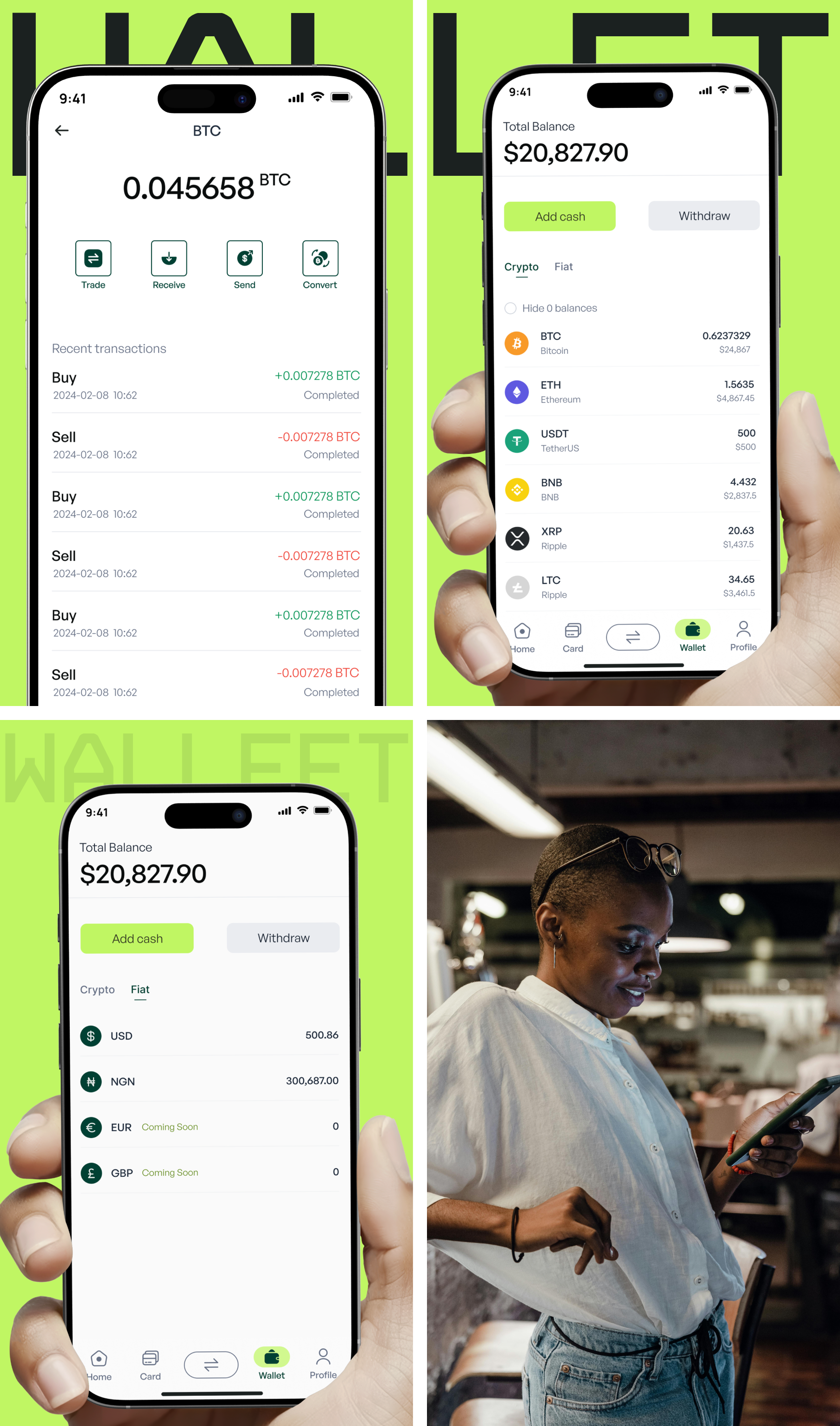 A combined wallet view that shows both crypto and cash balances. Users can track their assets, view transaction history, and move between their crypto and fiat wallets without switching screens.